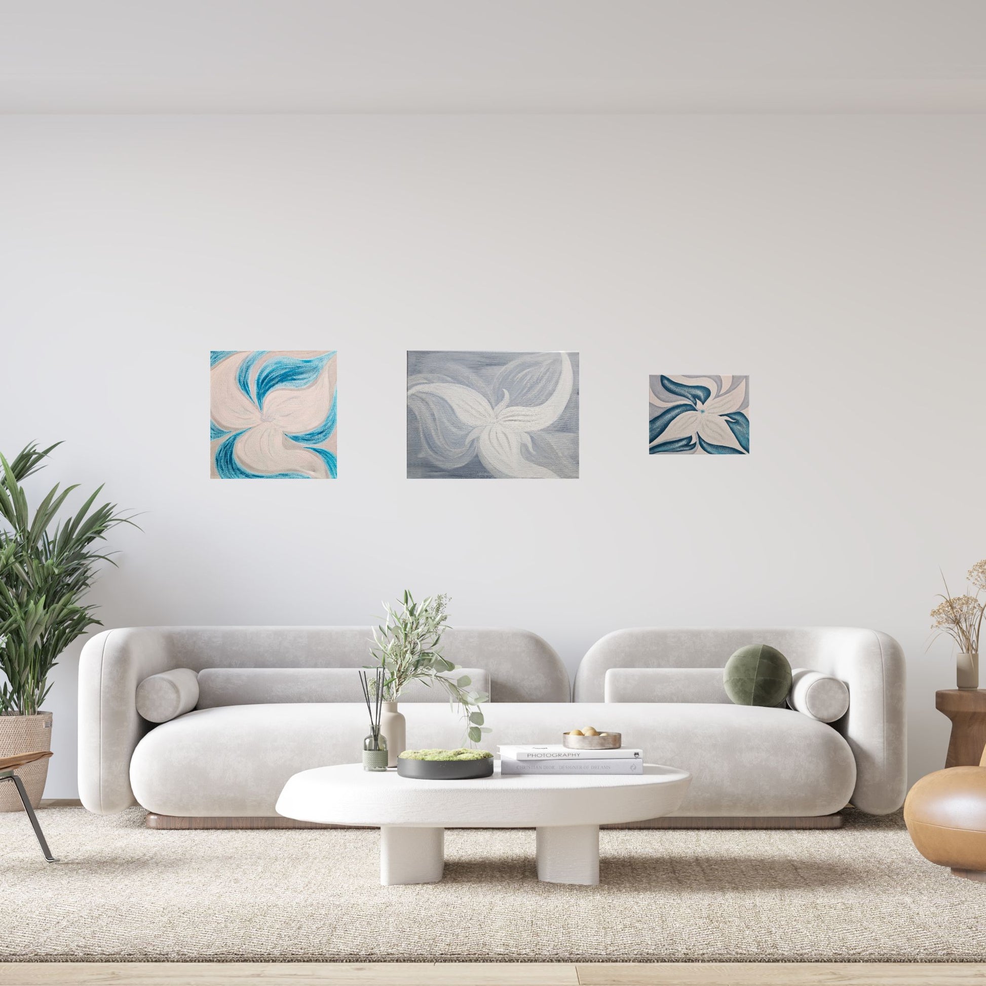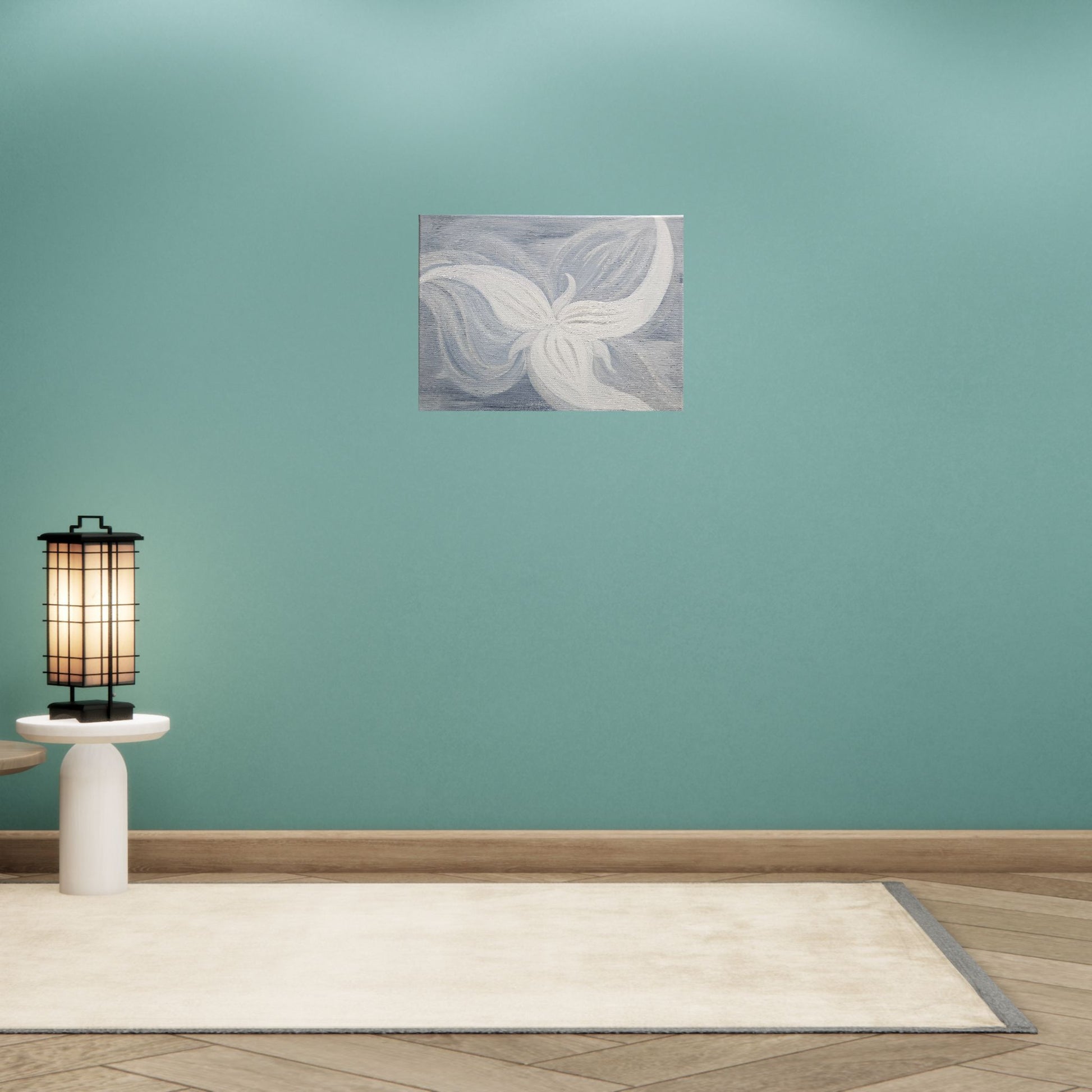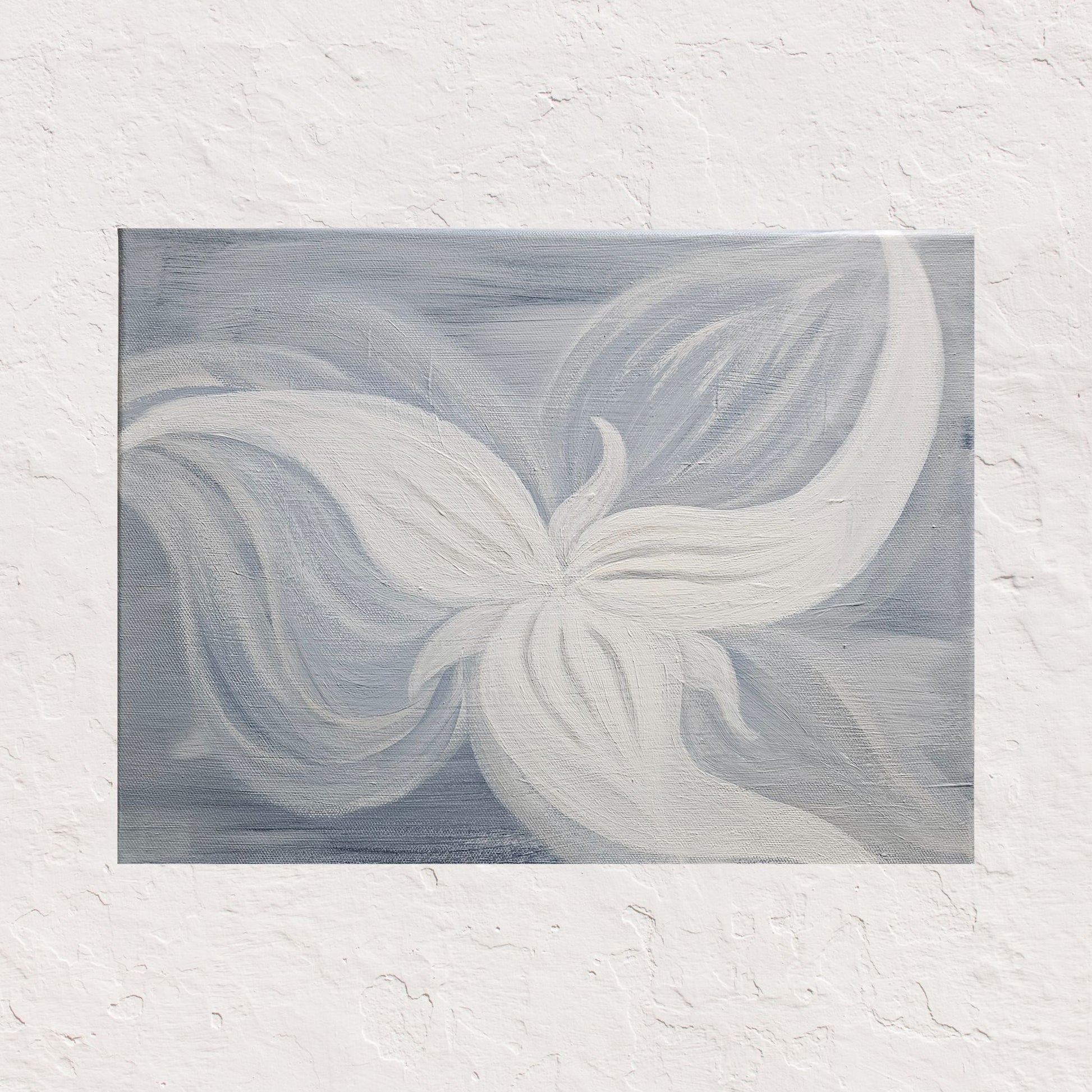 This neutral color palette of gray and white depicts a unique and abstract interpretation of the trillium flower. The trillium is the most beautiful flower in my hometown, Ohiopyle, PA. Add a touch of cool, calm elegance to your home decor.
