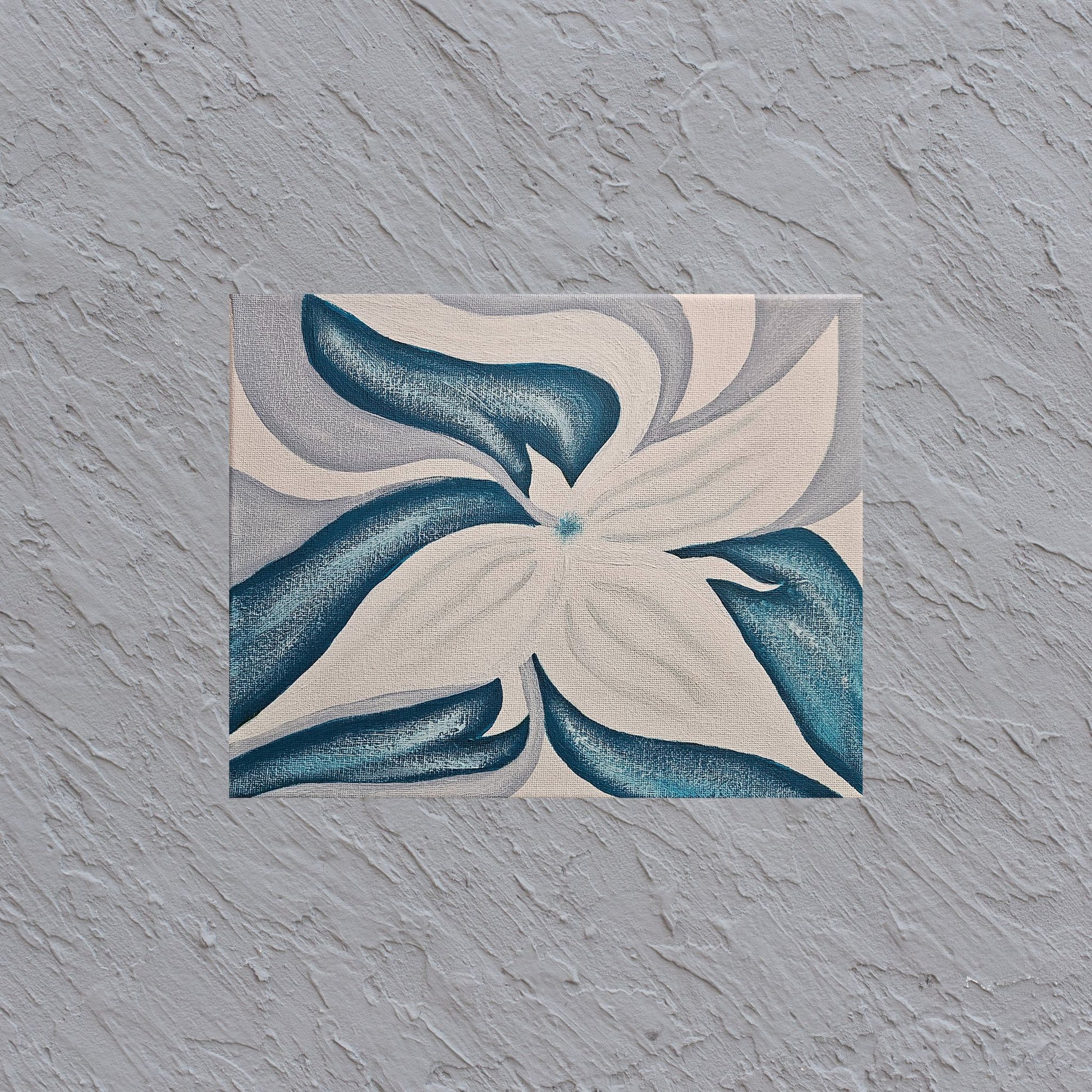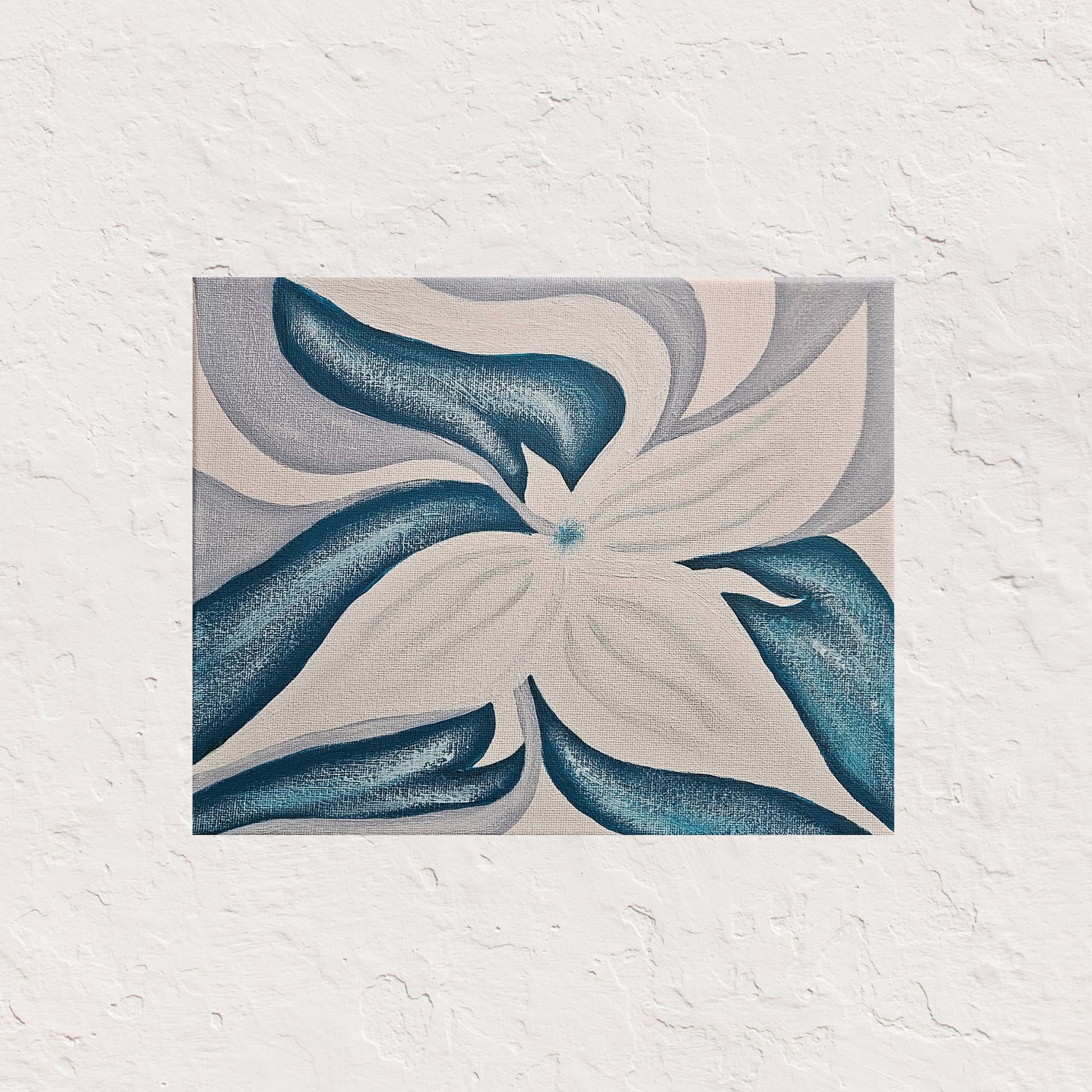 The trillium wildflower is unique in shape and beauty. Its three-leaf and petal design makes it easy to identify along the river banks of the Appalachians in the spring. These flowers bloom in such quantity that you're likely to see an entire mountainside covered in them! This piece features an abstract trillium in a cool color palette, bringing a clean, modern look to your home decor.